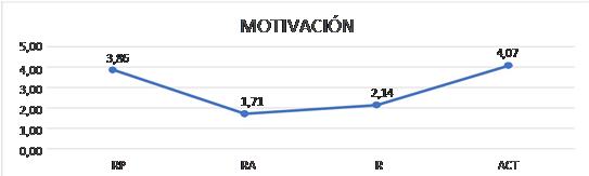 Se analiza en la Figura 2, que corresponde a la Dimensión Motivación, las siguientes variables: Realización Personal, con las siglas (RP), Responsabilidad (R), Reconocimiento de la Aportación, identificado como (RA) y Adecuación de las Condiciones de Trabajo con las siglas (ACT); con niveles bajos los ítems “RA” y “R” lo cual pone en manifiesto el escaso estímulo que la empresa otorga al desempeño y también el bajo compromiso que tiene el colaborador dentro de su entorno laboral.