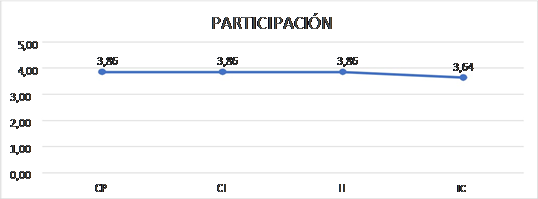 En la Figura 4, se evidencia la Dimensión Participación, con sus variables: Compromiso por la Productividad, con las siglas (CP), Compatibilización de Intereses, con la identificación (CI), tenemos el Intercambio de Información, con las siglas (II) e Involucración en el Cambio, con la identificación (IC); con promedios similares, sobre la media de satisfacción propuesta, pero sin llegar a un nivel de plenitud total, lo que determina que el empleado en general, no se siente parte del todo y su rendimiento se limita a la meta personal antes que a la meta empresarial.