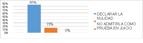 De acuerdo a la figura 3, La gran mayoría de los encuestados, con un 78%, cree que el juez debe excluir la prueba debido a que su vulneración la convierte en ilícita. Este porcentaje es significativamente más alto que las otras opciones, lo que sugiere una opinión mayoritaria en el grupo encuestado. Al detectarse una vulneración en la cadena de custodia, el juzgador debe excluir la prueba por su ilicitud. Esto se alinea con el principio del debido proceso, donde una prueba obtenida o manejada de forma indebida carece de validez legal. Los porcentajes de las otras opciones son muy bajos, lo que confirma la postura mayoritaria sobre la exclusión de la prueba.