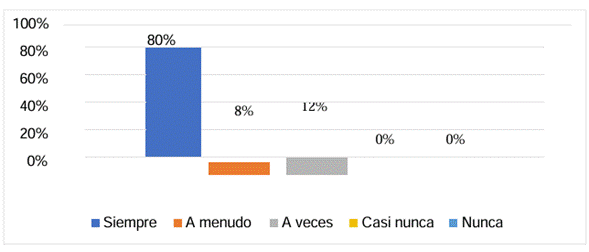 Se puede observar en la gráfica 1, que el criterio de los padres de familia respecto del uso de redes sociales de sus hijos. En este sentido, existe una alta frecuencia de uso, por cuanto un 80% de los padres de familia encuestados, considera que sus hijos, siempre usan las mismas. Frente a esto, la problemática se evidencia, debido al alto índice de uso de redes sociales por parte del grupo etario estudiado y en consecuente, son susceptibles de ver vulnerado su derecho a la intimidad, en el contexto de uso.