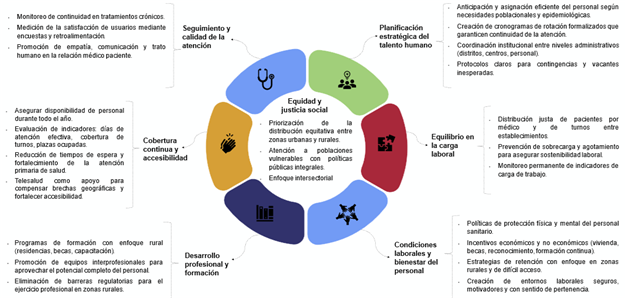 Este enfoque resulta esencial para lograr una distribución equitativa entre regiones urbanas y rurales. La estabilidad de la fuerza laboral es un pilar de la atención de calidad, sobre todo en áreas rurales con recursos limitados (Abelsen et al., 2020). La pandemia de COVID-19 evidenció la vulnerabilidad de los trabajadores sanitarios, quienes enfrentaron altos niveles de estrés, turnos extensos y cargas laborales excesivas. Esta experiencia refuerza la condición urgente de políticas que garanticen condiciones laborales justas y protejan tanto la salud física como mental del personal (Young, 2025). La relación entre planificación de talento humano y sistemas resilientes muestra que una correcta gestión del personal fortalece la capacidad del sistema para adaptarse a crisis y cambios.