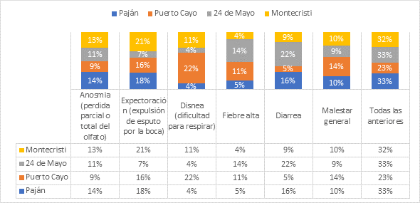 En el grafico 1, se presenta el análisis descriptivo frecuencial del reconocimiento del cuadro clínico que causa el sars-cov-2, en la misma se indica que el 33% por igual de los habitantes investigados de la comunidad 24 de Mayo y el Pajan indicaron que reconocían todos los síntomas. Seguido del 32% de la comunidad de Montecristi y un 23% de la comunidad de Puerto cayo. Asimismo, se pudo constatar que la mayor parte de los habitantes de las diferentes localidades de la zona sur de Manabí, consideran según su criterio que los síntomas como: anosmia, hipertermia, expectoración, disnea, diarrea y malestar general están asociados al cuadro clínico que causa el SARS-CoV-2.