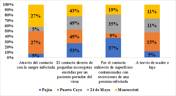 En el grafico 2, se presenta el análisis descriptivo frecuencial de la pregunta relacionada con el mecanismo de transmisión del SARS-CoV-2, y con mayor frecuencia de un 49% por igual de los investigados en las comunidades de Puerto Cayo y 24 de Mayo, un 53% de la comunidad del Pajan y 43% de la comunidad de Montecristi coincidieron en opinar que el mecanismo de trasmisión era el contacto directo de pequeñas microgotas emitidas por un paciente portador del virus. Seguido del 35% y 37% en opinión de las comunidades del 24 de Mayo y Pajan respectivamente que señalaron como mecanismo por el contacto directo por superficies contaminadas con secreciones de una persona infectada. Seguido por porcentajes menores de opiniones en las comunidades investigadas que indicaron la transmisión del SARS-CoV-2 por el contacto indirecto con superficies contaminadas.
