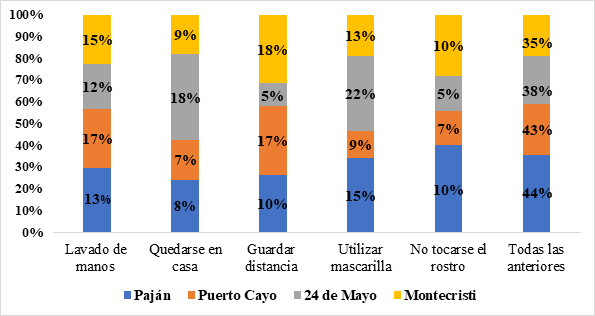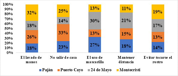 En el grafico 4, se indica el análisis descriptivo frecuencial de las medidas de prevención del Covid-19, y entre los porcentajes más altos de opiniones el 33% de la población de Puerto Cayo consideran no salir de casa como Medida de prevención ante la Covid-19. El 30% de la comunidad 24 de Mayo el uso de la mascarilla y el 32% de la comunidad de Montecristi el lavado permanente de las manos. Entre otras medidas, señalaron en las comunidades de Paján y Puerto Cayo el remojar el calzado con una sustancia desinfectante, así también en la comunidad de Montecristi es donde utilizan en su mayoría la desinfección con alcohol gel.