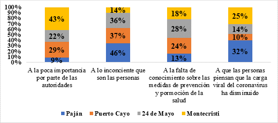 El grafico 5, se presenta el análisis descriptivo frecuencial de la percepción de los habitantes ante el incremento de contagios por el coronavirus, donde el 46%, 36% y 37% de las comunidades del Pajan, Montecristi y 24 de Mayo con mayor porcentaje de opiniones consideran que el incremento de contagios por Coronavirus se debe a la inconciencia de las personas, mientras que 43% de la comunidad de Montecristi indicaron que se debe a la poca importancia por parte de las autoridades. También se destaca, el hecho en la cual la misma comunidad del Pajan con un 32% de las opiniones la dan importancia a la percepción que poseen como incremento del virus a que las personas piensan que la carga viral del coronavirus ha disminuido.