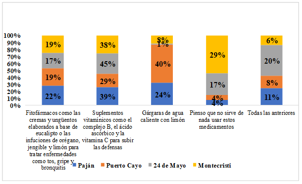 En el grafico 6, se presenta el análisis descriptivo frecuencial del indicador medicamentos y/o plantas para prevenir o tratar las enfermedades respiratorias que causa el coronavirus, en la misma se indica que entre los habitantes de las comunidades investigadas, que ante el miedo de contagiarse en las casas asistenciales o centros de salud cercanos, preferían tomar infusiones como medidas de prevención ante el Covid-19. Se destaca el hecho, en la cual el 45% de la comunidad del 24 de Mayo tomaban suplementos vitamínicos como el complejo B, el calcio ascórbico y la vitamina C para subir sus defensas y el 40% de la comunidad de Puerto Cayo señalo que realizan infusiones o gárgaras a base de plantas medicinales (limón, manzanilla, orégano y eucalipto) como opción viable en ese momento. Para ello, recogían de sus siembras lo que tenían y compraban otras plantas que no se cosechan en esta región.