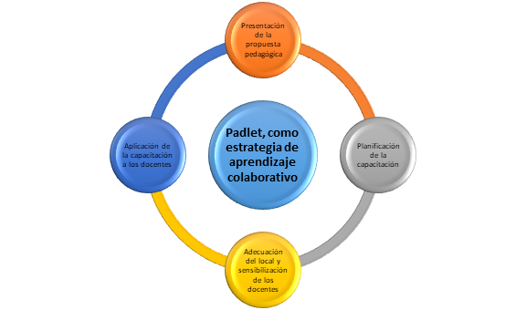 The importance of generating collaborative and active work environments where significant learning takes place, through the use of technological tools to create motivating, communicative and innovative classes. The objective of the research is to analyze how Padlet can contribute as a collaborative work tool for the teaching process, which was verified by applying a descriptive, non-experimental, cross-sectional cohort research methodology through the application of the survey composed of 11 questions, from which the data were obtained that were analyzed through the SPSS program, which allowed defining the problem and in turn raising a proposal for teacher training regarding the Use of the Padlet as a collaborative learning strategy.