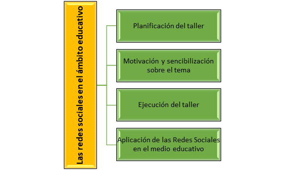 Planificación del taller para aplicar un módulo de capacitación en cuanto al uso de las redes sociales con fines educativos. Esto implica realizar las siguientes acciones: Organización de las actividades, recursos y objetivos. Adecuación del local para la capacitación. Elaboración de material bibliográfico en donde se estipule paso a paso las acciones a realizar para usar las redes sociales