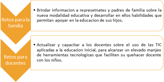 En la actualidad, la educación a distancia que tradicionalmente se venía dando como una modalidad educativa en nuestro país, ha experimentado un punto de inflexión con la llegada de la pandemia COVID-19, misma que, ha azotado al planeta en áreas como la salud, en el área social, humana, y que, por tanto, influyó también de manera significativa en el campo educativo, lo cual, ha obligado de manera irreversible e impostergable la implementación tecnológica en los procesos formativos a través de la modalidad virtual, que hasta hace poco se caracterizaba por ser netamente presencial. Por tanto, al ser la única opción educativa del presente, se encuentra aludida del mismo modo el nivel inicial, el cual se ha visto obligado a acogerse a este estilo, la misma que desde la óptica de Arriagada (2020) no cumple con un plan ordenado sino es fruto de la desesperación por concluir con un proyecto educativo establecido.