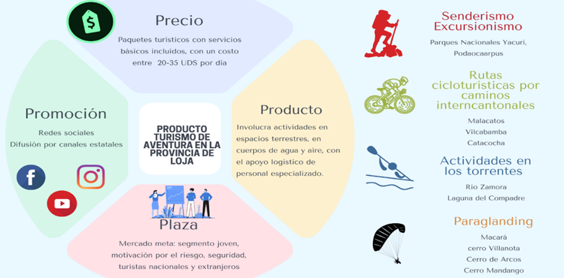 La figura 6 determina el producto turístico determinado con base a las potencialidades analizadas, por consiguiente, se trata de itinerarios diseñados para feriados y fines de semana cuya duración oscila entre uno y dos días de duración con la combinación de actividades ya sea en aire, agua o tierra con el aprovechamiento de los recursos naturales: senderismo en los parques nacionales, circuitos ciclo turísticos intercantonales, actividades en los rápidos de los ríos y ejecución de parapente en las elevaciones de la provincia de Loja. Desde luego, el segmento de mercado meta que es un target joven por ello se prevé que la plaza sea a nivel nacional e internacional, razón por la cual como canales de promoción y difusión se precisa de las redes sociales, con el apoyo de los canales de comunicación digitales del ministerio del ramo, por último, el precio por actividades y al ser un producto nuevo dentro del mercado se mantiene en un precio accesible.