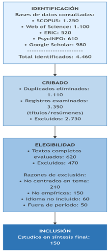 Se consultaron cinco repositorios: SCOPUS, Web of Science, ERIC, PsycINFO con el apoyo del Google Scholar. La estrategia de búsqueda fue una cadena combinada con operadores booleanos e incluyó campos de título, resumen y palabras claves. El proceso de búsqueda y selección de estudios siguió las cuatro fases de PRISMA: identificación, cribado, elegibilidad e inclusión. Se documentaron las decisiones en cada etapa y se elaboró un diagrama de flujo PRISMA para transparentar el recorrido de recuperación de estudios y justificar las exclusiones. De un total de 4460 publicaciones encontradas en las bases de datos consultadas (población), después de concluidas las 4 etapas del protocolo PRISMA, quedaron 150 estudios (muestra) para análisis. La figura 1 exhibe los resultados de la aplicación del protocolo PRISMA en cada etapa.