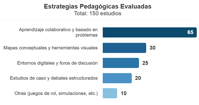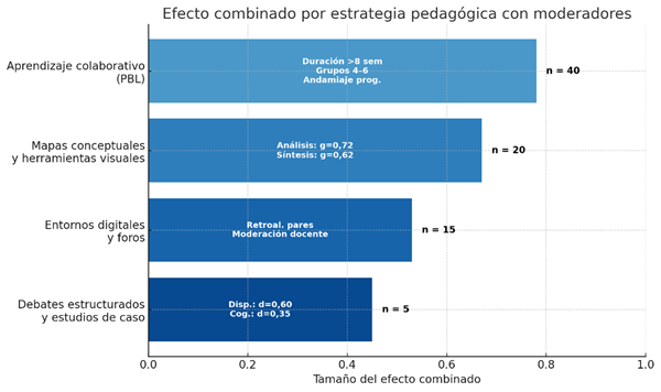 Los 80 estudios experimentales y cuasiexperimentales se agruparon en cuatro categorías de estrategias. La primera categoría de estrategia que es el aprendizaje colaborativo y basado en problemas se utilizó en 40 estudios con un resultado de tamaño de efecto combinado igual a 0,78 y un intervalo de confianza del 95 %. El promedio de duración de estos estudios fue mayor a 8 semanas y se realizó a grupos de 4 a 6 estudiantes con un andamiaje progresivo. La categoría de estrategia mapas conceptuales y herramientas visuales fue utilizada en 20 estudios con un tamaño de efecto combinado de 0,67 y un intervalo de confianza al 95 %. Esta estrategia tuvo mejores resultados en análisis (g=0,72) que en síntesis (g=0,62). La categoría de estrategia entornos digitales y foros de discusión estuvo representada en 15 estudios con un tamaño de efecto medio de 0,53 y un intervalo de confianza del 95 %. Esta estrategia tuvo una eficacia mayor cuando se usó retroalimentación entre pares y moderación docente. La estrategia debates estructurados y estudios de casos fueron aplicados en 5 estudios con un tamaño de efecto de pequeño a medio de 0,45 y un intervalo de confianza del 95 %. Esta categoría tuvo un mejor impacto en disposiciones críticas (d=0,60) que en habilidades cognitivas (d=0,35). La figura 3 resume de forma gráfica el valor del efecto combinado por estrategia pedagógica con sus moderadores.