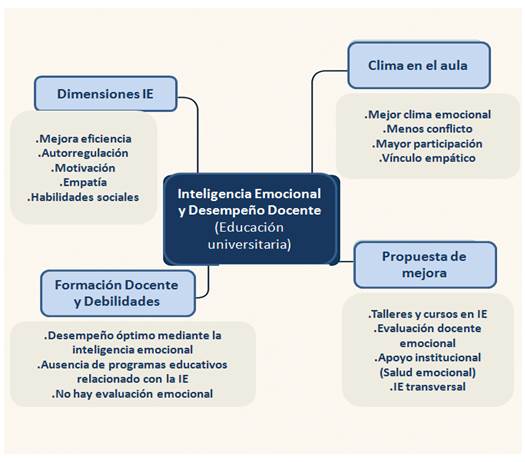 El análisis de las fuentes revisadas también destaca que la inteligencia emocional contribuye significativamente al clima de aula, un factor clave en el proceso de enseñanza-aprendizaje (Mora et al., 2022; Quiroz et al., 2025). Un docente capaz de identificar y manejar emociones propias y ajenas es más propenso a prevenir conflictos, manejar el estrés y resolver situaciones críticas con asertividad (Maldonado, Noroña, Vega & Molina, 2023).