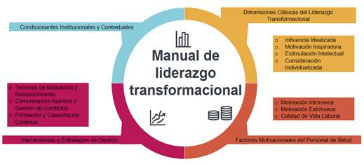 El manual de liderazgo transformacional para los Centros de Salud de primer nivel de la Policía Nacional del Ecuador está diseñado como una guía práctica que integra fundamentos teóricos y estrategias aplicables para potenciar la motivación, el compromiso y el desempeño del personal médico. Su contenido se organiza en torno a las dimensiones clásicas del liderazgo transformacional, la influencia idealizada, motivación inspiradora, estimulación intelectual y consideración individualizada, y de los factores motivacionales tanto intrínsecos, como el sentido de logro y orgullo profesional, y extrínsecos, incluyendo condiciones laborales seguras, incentivos y reconocimiento (ver figura 1).